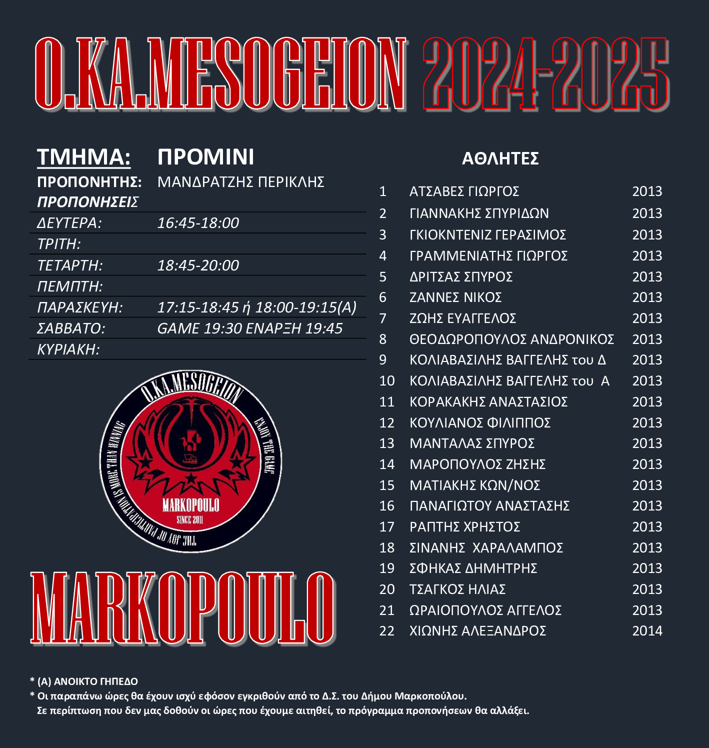 Το παρακάτω πρόγραμμα προπονήσεων έχει σταλεί προς έγκριση από το ΔΣ του Δήμου Μαρκοπούλου. Οποιαδήποτε αλλαγή στις αιτούμενες ώρες (οι ίδιες που είχαμε στην διάθεσή μας μέχρι σήμερα) θα επηρεάσει όλο το πρόγραμμα.